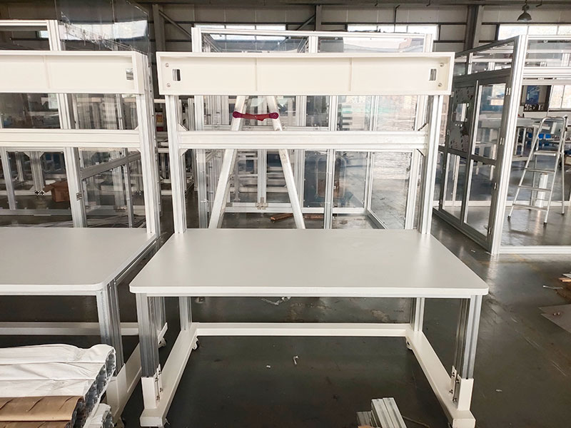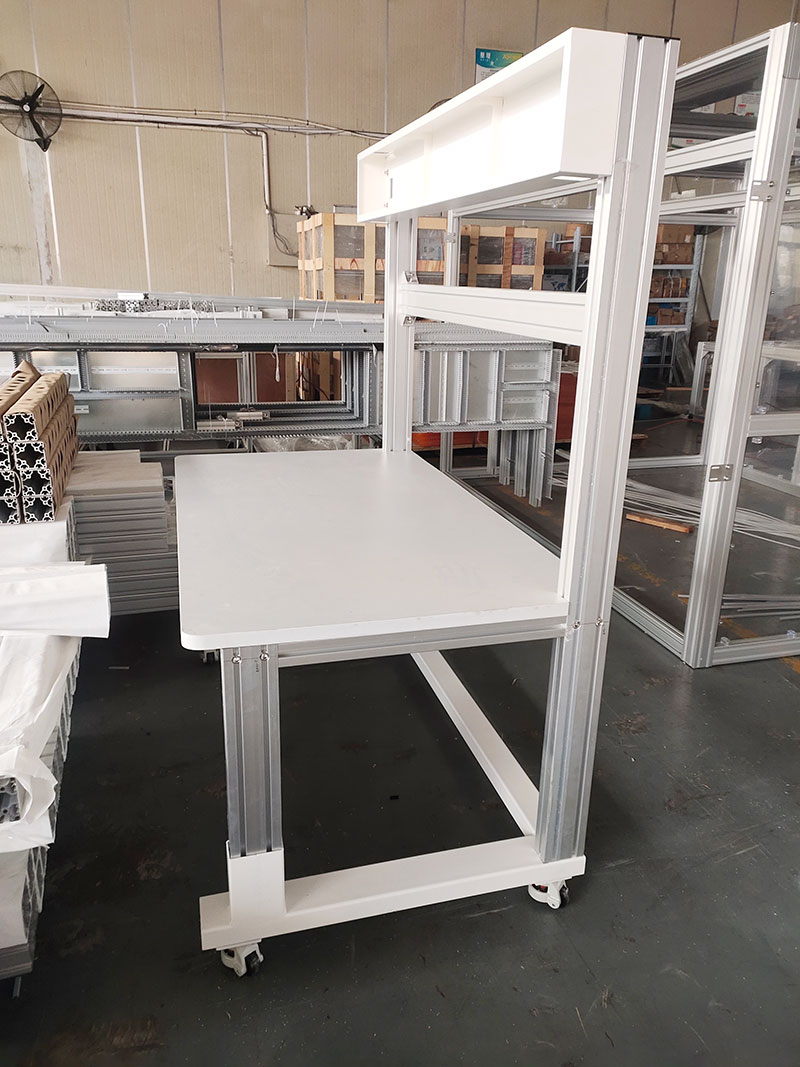 鋁型材工作臺適合于模具、鉗工、檢測、維修、組裝等各種不同應(yīng)用場合,具有良好的耐腐蝕性,耐臟性,抗沖擊性和承重性??膳浜喜煌氖褂靡筮x擇不同桌面材質(zhì);所配置的抽屜、柜門方便使用者存儲(chǔ)工具;桌角上預(yù)留電源孔,方便安裝電源插座。工作臺(桌)分為輕型(可承重300公斤),中型和重型工作臺(桌)可承重1000公斤;特制的工作臺可按需定制??筛鶕?jù)需要靈活地配置各種吊柜、單柜、雙柜等,可加裝掛板,電器板,燈頂板、調(diào)節(jié)腳杯,輪子,擱板等桌上部件,具有多種選擇,能夠滿足各種工位的需求。